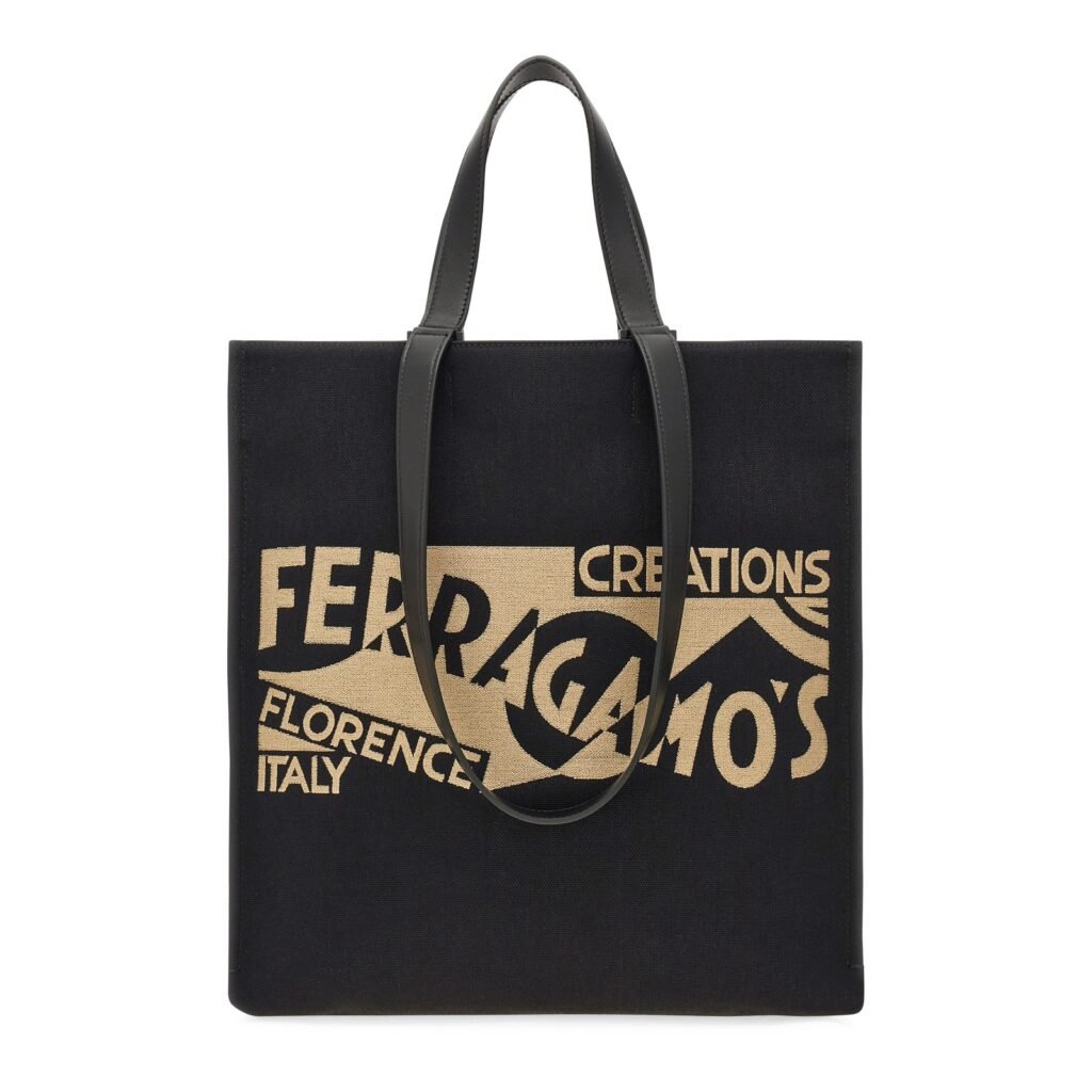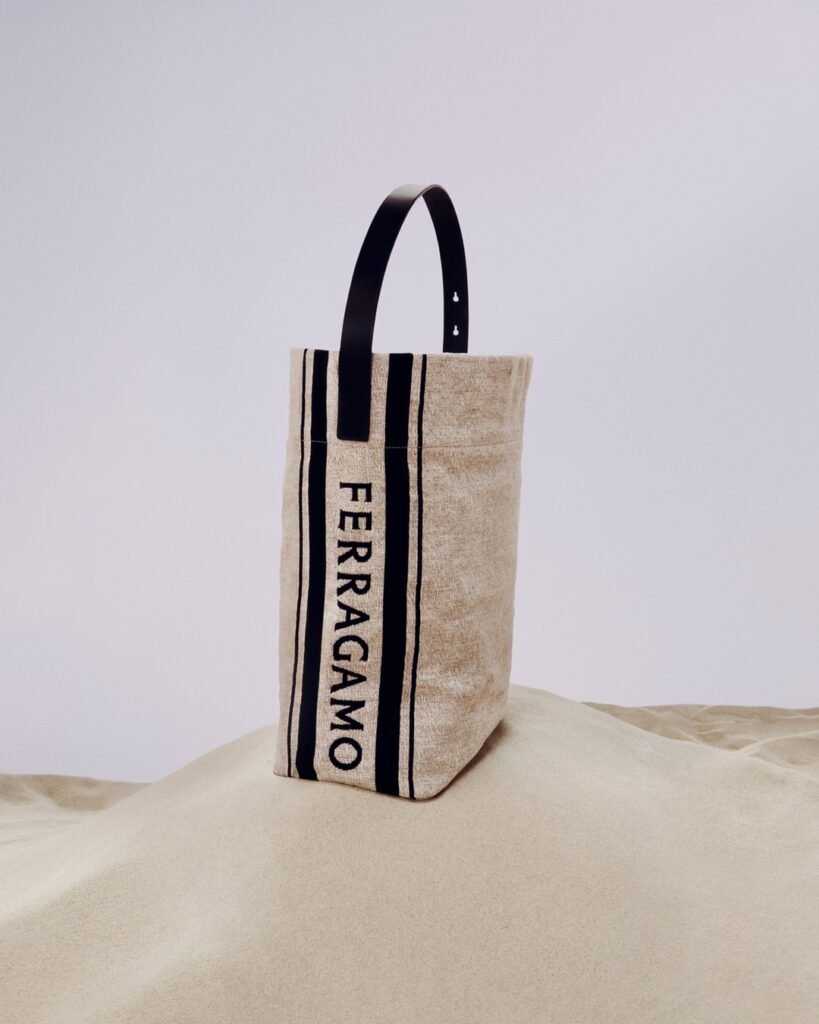 O uso do novo logo Ferragamo adiciona um elemento gráfico a vários estilos, incluindo a bolsa clássica com estrutura de tecido jacquard e alça de couro ajustável, sandálias com alças crossover, alpargatas e a bolsa pouch.