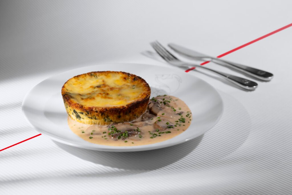 O menu inclui entradas inventivas e refinadas, como o suflê de Beaufort com denominação de origem protegida, creme de cogumelos com trufas e foie gras com salsify, chutney de mirtilo e cebola. Além disso, apresenta oito novos pratos que celebram a culinária francesa e, especialmente, a cozinha savoyarde. Entre as delícias disponíveis, destacam-se a polenta com cogumelos selvagens, espinafre e queijo das montanhas, e o quenelle de vieiras com molho de creme ácido e legumes de raiz.