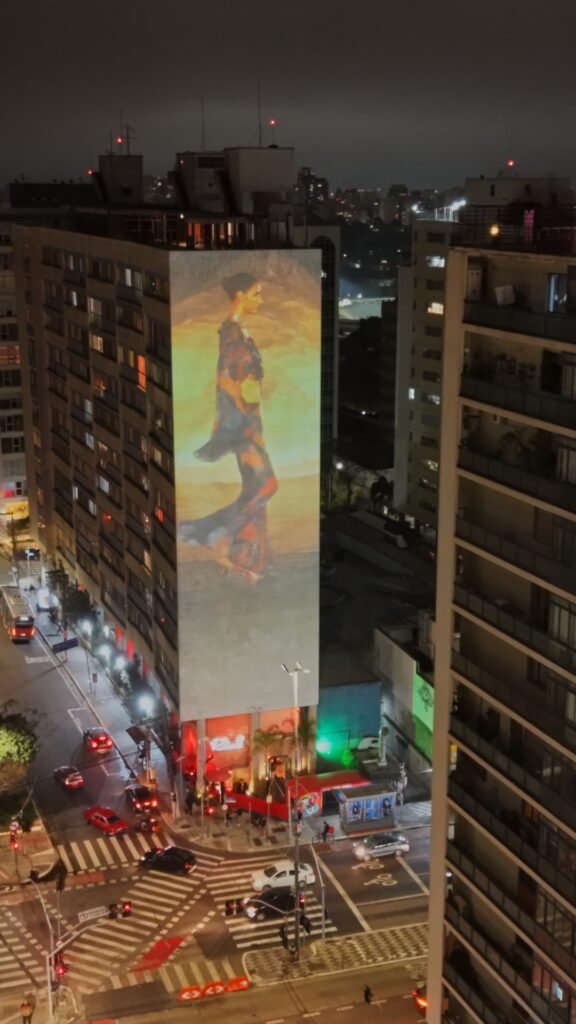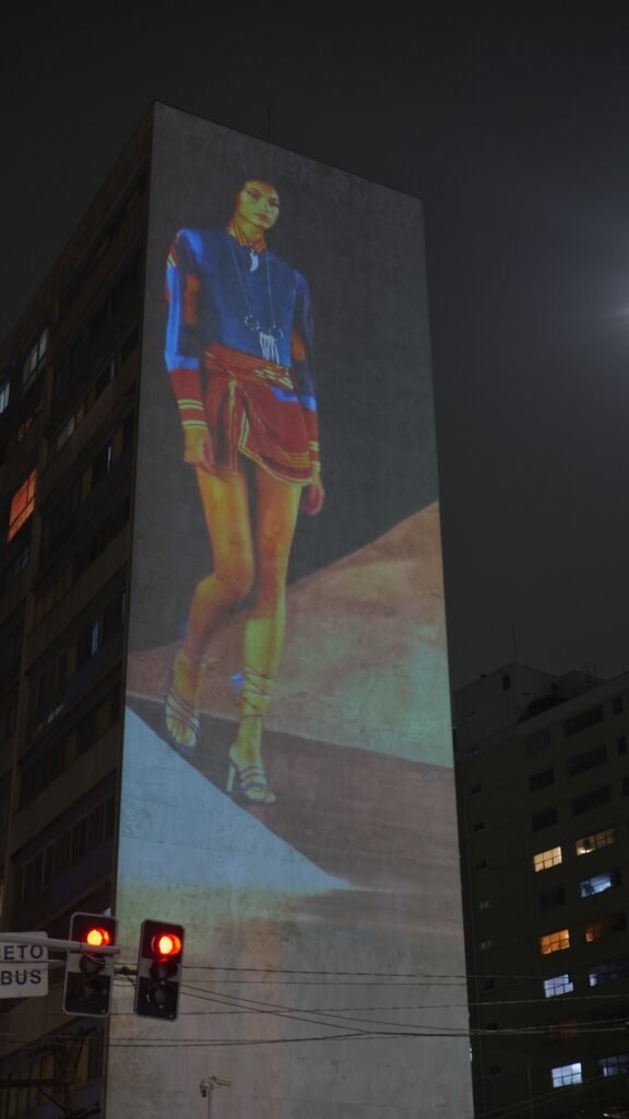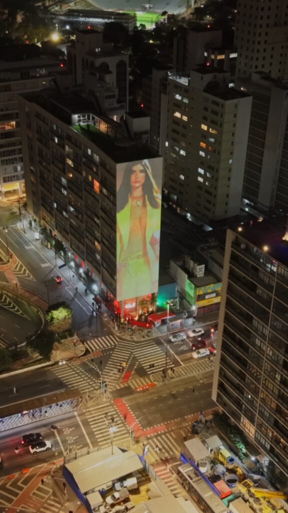 A projeção ganhou forma como um presente para a cidade, estampando a mensagem “Um Oásis urbano surge hoje”, trazendo o conceito de escapismo contemporâneo, convidando o público a vivenciar um refúgio inesperado em meio à correria da cidade. A ação evidencia como a marca reinterpreta o cotidiano, oferecendo experiências que desafiam expectativas e conectam criatividade, estilo e presença urbana de forma inédita. Ao final do desfile, a transmissão no prédio se encerrou, deixando no ar a lembrança de um instante inesperado e efêmero, em diálogo com a essência da coleção.
