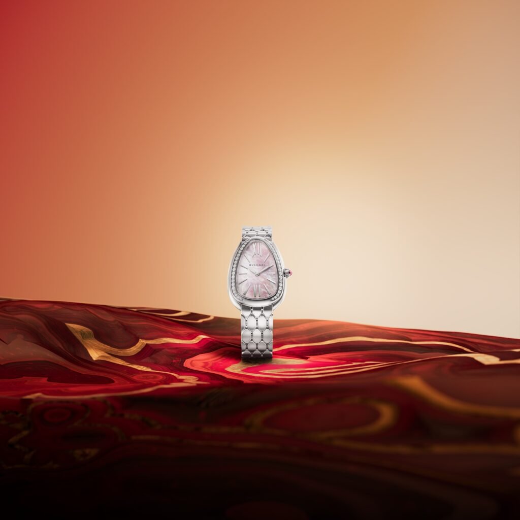 Na categoria de relógios, o ícone da feminilidade máxima Serpenti Seduttori é introduzido em uma Edição Limitada de 188 peças, apresentando exclusivamente um mostrador de madrepérola rosa. Feito em aço inoxidável, sua caixa curvilínea, evocando o formato da cabeça de uma serpente, é iluminada na lateral por uma rubelita rosa no topo da coroa – uma assinatura da joalheria romana. A pulseira, com suas escamas hexagonais emblemáticas articuladas, é perfeitamente integrada à caixa como uma segunda pele sensual. Refletindo um espectro de nuances, o fascinante mostrador de madrepérola rosa reforça o apelo magnético da Serpenti, celebrando os momentos preciosos que trazem brilho à vida cotidiana. Uma gravação de Limited Edition no verso da caixa dá o toque final ao modelo.