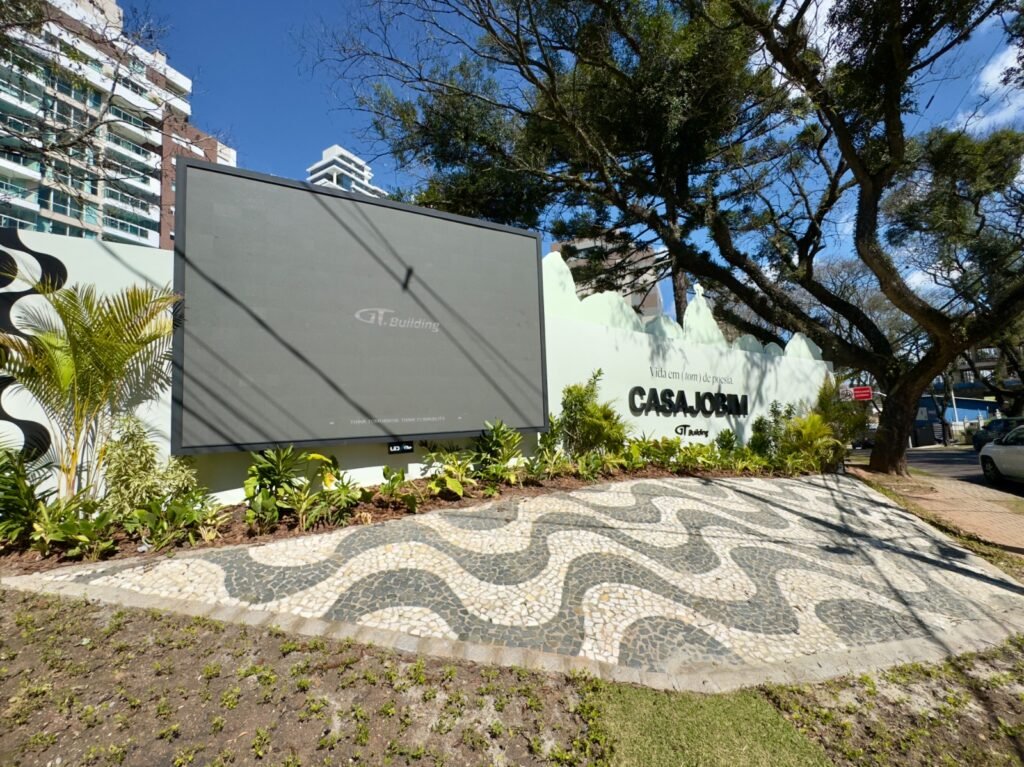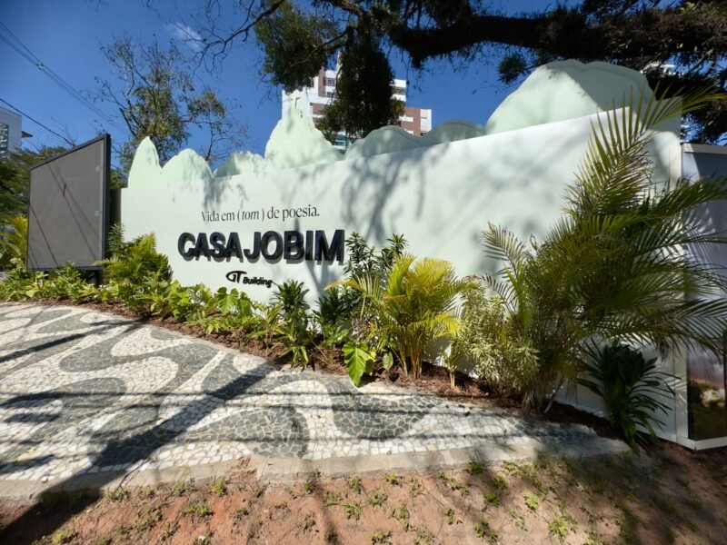 Talvez o melhor exemplo do potencial desse conceito seja o Casa Jobim, empreendimento que recriou a atmosfera da bossa nova e do Rio de Janeiro em plena fase de execução. O painel foi recuado, ocupando parte do terreno privado para dar lugar a uma praça pública sensorial, com piso em petit-pavê, paisagismo tropical exuberante, sistema de som ambiente que toca Wave, de Tom Jobim, e um telão de LED de 4×3,5 metros que exibe conteúdos visuais.