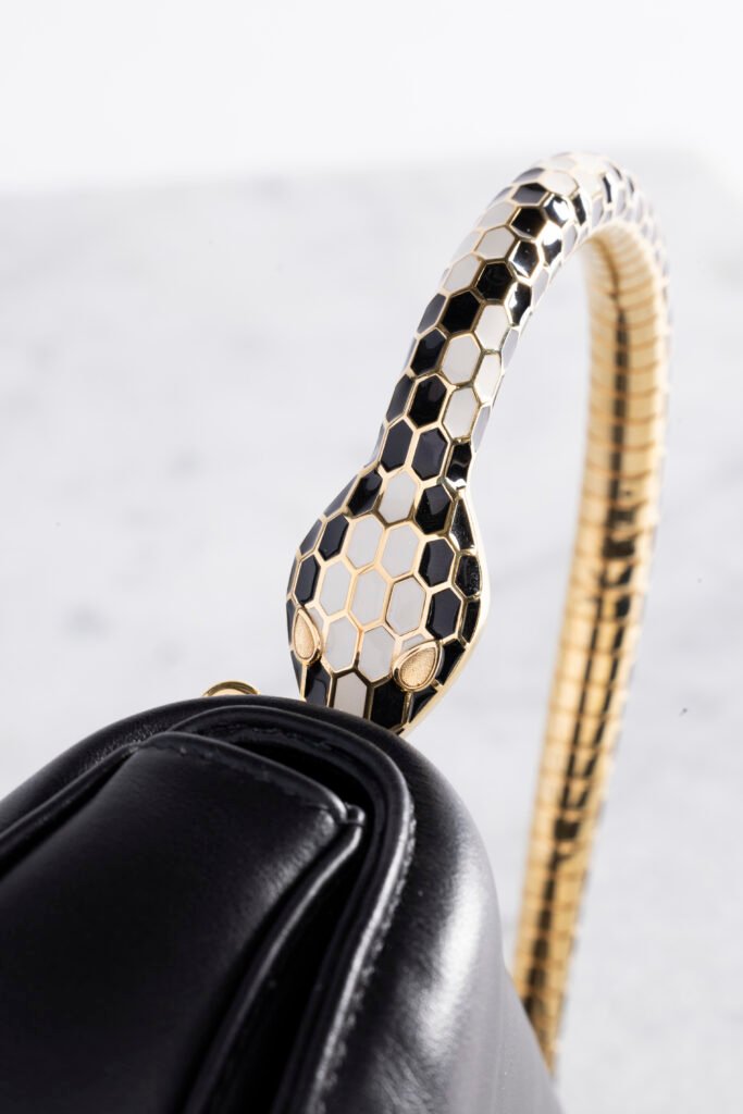 Inspirando-se nos vastos arquivos e DNA incomparável de joias da Bvlgari, a alça metálica da bolsa remete ao famoso relógio-joia Bvlgari Serpenti Harlequin de 1968, um modelo icônico adornado com esmaltação multicolorida. Uma fonte de inspiração por trás de uma das primeiras colaborações entre a Maison romana e Mary Katrantzou, ela continua a explorar a identidade multifacetada deste ícone da Bvlgari hoje em seu papel como Diretora Criativa de Artigos de Couro e Acessórios da marca.