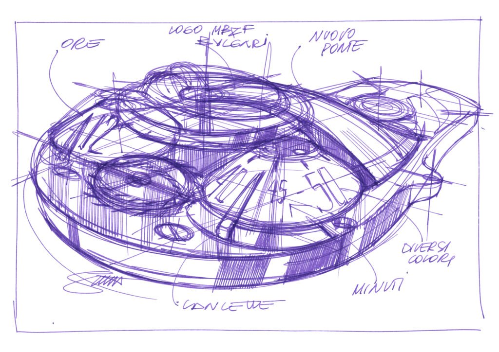 De acordo com Fabrizio Buonamassa Stigliani, os aspectos do design “foram prazerosos de criar”, talvez dando a impressão de que essa parte do processo foi relativamente fácil – mas as centenas de esboços e dezenas de modelos impressos em 3D atestam o oposto. Ao contrário de uma caixa redonda clássica, que oferece apenas algumas dimensões para experimentar, a caixa do Bvlgari x MB&F Serpenti não poderia ser mais complicada. Como um automóvel, a visão é radicalmente diferente dependendo se você o admira de frente, de lado, de cima, de trás… e todas essas visões devem ser igualmente satisfatórias. Como uma equação cuidadosamente equilibrada com múltiplas variáveis, qualquer ajuste em um ângulo ou curva específica, embora melhore uma certa visão, pode potencialmente comprometer outra. Isso resultou em inúmeras iterações do design Bvlgari x MB&F Serpenti.