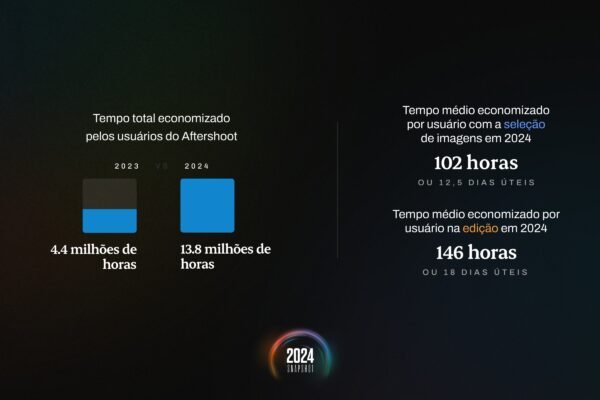 São Paulo, 8 de janeiro de 2024. Os fotógrafos economizaram mais de 13 milhões de horas com as ferramentas de IA da Aftershoot – o equivalente a mais de 1570 anos ou 15 séculos. Em média, cada usuário economizou mais de 31 dias inteiros de trabalho com a seleção e edição de imagens com IA. O Snapshot da Aftershoot revela como a tecnologia de IA está redefinindo os fluxos de trabalho e aumentando a produtividade dos fotógrafos. Com mais de 5 bilhões de imagens processadas usando a Aftershoot em 2024, a adoção de ferramentas baseadas em IA se tornou a nova norma na fotografia.