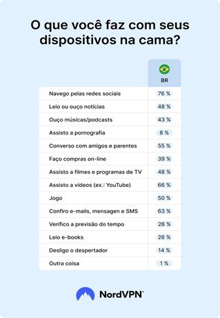 Os números revelam que, no Brasil, os indivíduos estão entre os mais propensos a usar múltiplos aparelhos quando estão deitados. Entre os mais populares estão os smartphones, usados por 94% dos entrevistados, seguidos por televisores (56%) e laptops/computadores (42%).