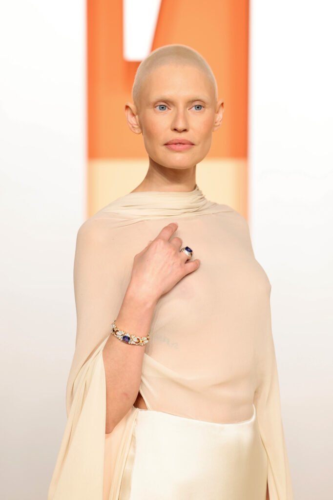 A modelo italiana Bianca Balti usou uma pulseira Alta Joalheria em ouro amarelo com elementos de madrepérola e 1 safira vintage em lapidação cushion, acompanhado de um anel de Alta Joalheria em ouro rosé com 10 safiras polidas.
