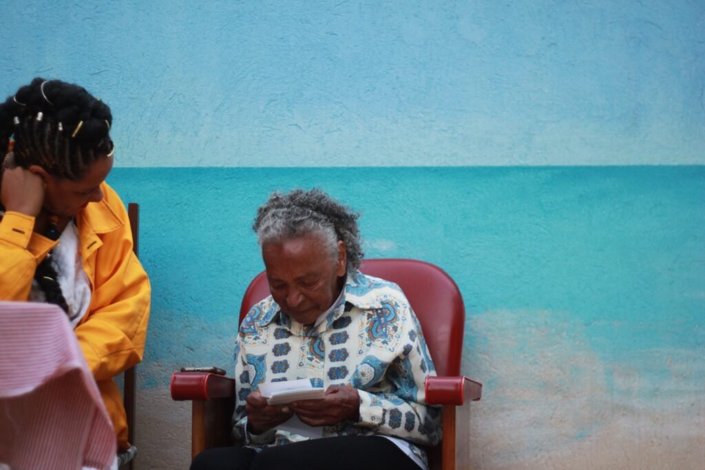 Começava ali o nascimento de um projeto que a família apresenta, partindo de conversas com a avó, Dirce Poli, de 95 anos, e que agora conta também com a presença em cena da mãe, Neuza Poli, e da irmã, Mafoane Odara. Nele, o público é convidado a adentrar um espaço que remete a um ambiente familiar acolhedor, que pode ser a casa de vó ou uma festa dos anos 90, com boa comida e muita música, em que as narrativas vão sendo reconstruídas pelas vozes, sabores e olhares presentes.