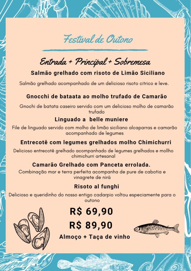 Vai até o dia 22 de junho o Festival de Outono do Lupe Cozinha do Mar & Café, onde é possível provar uma sequência de pratos deliciosos, servidos no almoço e jantar, por apenas R$ 69,90.