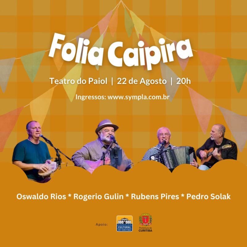 Prepare-se para uma noite de pura emoção e tradição. O show “Folia Caipira” chega ao Teatro do Paiol no dia 22 de agosto, às 20h, para uma verdadeira celebração da música de raiz brasileira. O espetáculo reunirá grandes nomes da cena musical paranaense em uma apresentação que promete levar o público a uma viagem ao coração da cultura caipira.