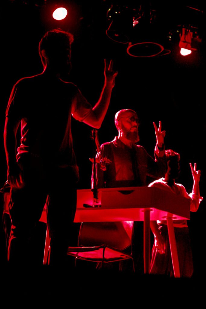 Grupo Carmin. Dirigida por Quitéria Kelly, com dramaturgia de Henrique Fontes e Pablo Capistrano. Elenco: Henrique Fontes, Rafael Guedes e Igor Fortunato. Direção e Figurino: Quitéria Kelly. Assistência de Direção, Dramaturgia Audiovisual e Desenho de Luz: Pedro Fiuza. Assistente de Produção e Direção de Palco: Daniel Torres. Consultoria Histórica e de Roteiro: Durval Muniz de Albuquerque Jr. Direção de Arte e Cenografia: Mathieu Duvignaud. Dramaturgia: Henrique Fontes e Pablo Capistrano. Preparação Corporal: Ana Claudia Albano Viana. Preparação Vocal: Gilmar Bedaque. Produção Executiva: Mariana Hardi. Trilha Sonora: Gabriel Souto / Toni Gregório. Design Gráfico: Teo Viana / Vítor Bezerra. Xilogravura: Erick Lima. Costura: Kátia Dantas. Cenotécnica: Irapuã Junior. Edição de Vídeo: Juliano Barreto, Pedro Fiuza. Locução: Daniele Avila Small (“diretora carioca”) / Giovana Soar (“diretora paulistana”). Assistência Técnica: Anderson Galdino.
