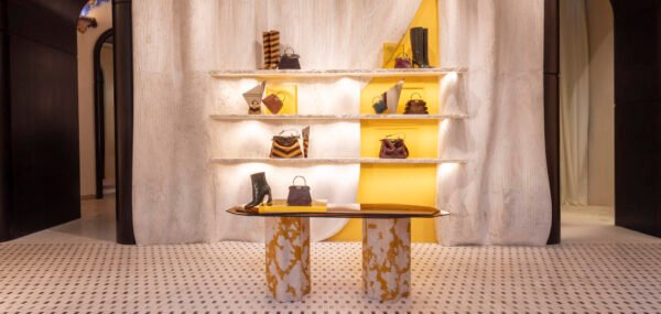O novo conceito de boutique, projetado pelo Departamento de Arquitetura da FENDI, funde detalhes que remetem aos interiores milaneses dos anos 1930 com elementos inconfundivelmente FENDI. Partindo da suavidade das curvas inspiradas no trabalho artesanal em pele até as formas arqueadas, esses elementos são dispostos em continuidade com as silhuetas limpas das escadarias de Milão e sua característica contraposição de texturas. Assim se inicia um sofisticado equilíbrio entre os padrões de mármore pré-existentes do edifício e os mármores especiais da Maison, inspirados nos pisos da Roma Antiga e no legado da FENDI.