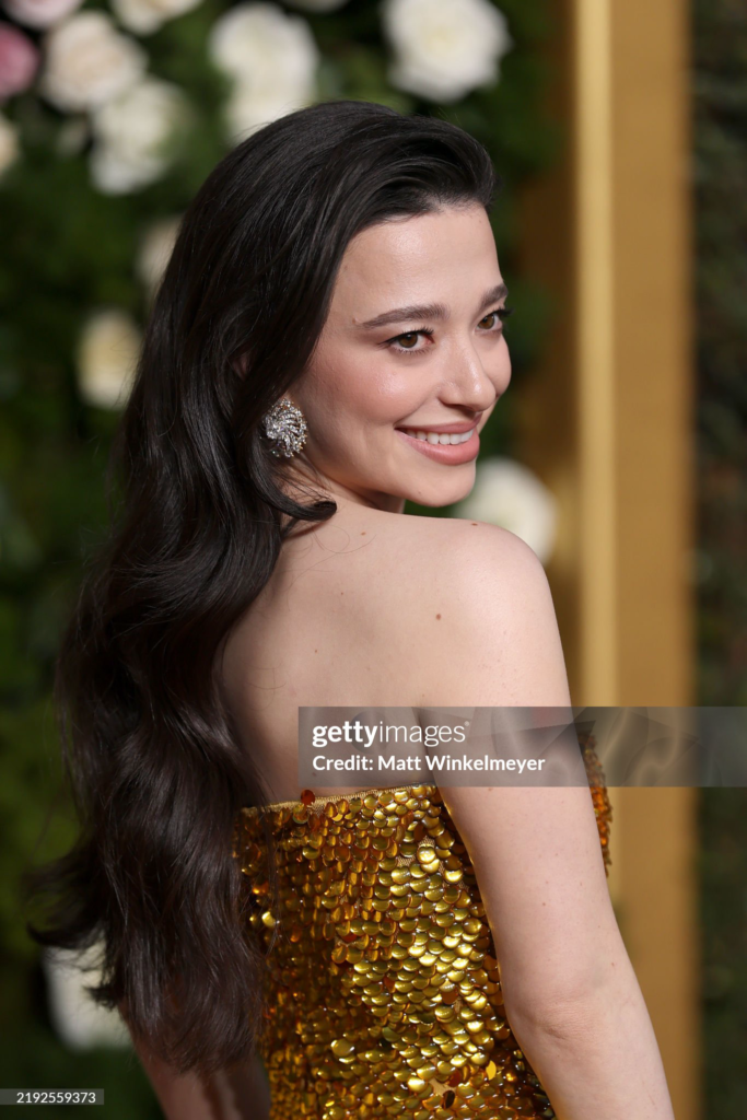 Mikey Madison usou brincos e um anel em platina e ouro amarelo da coleção 2024 Tiffany Blue Book.