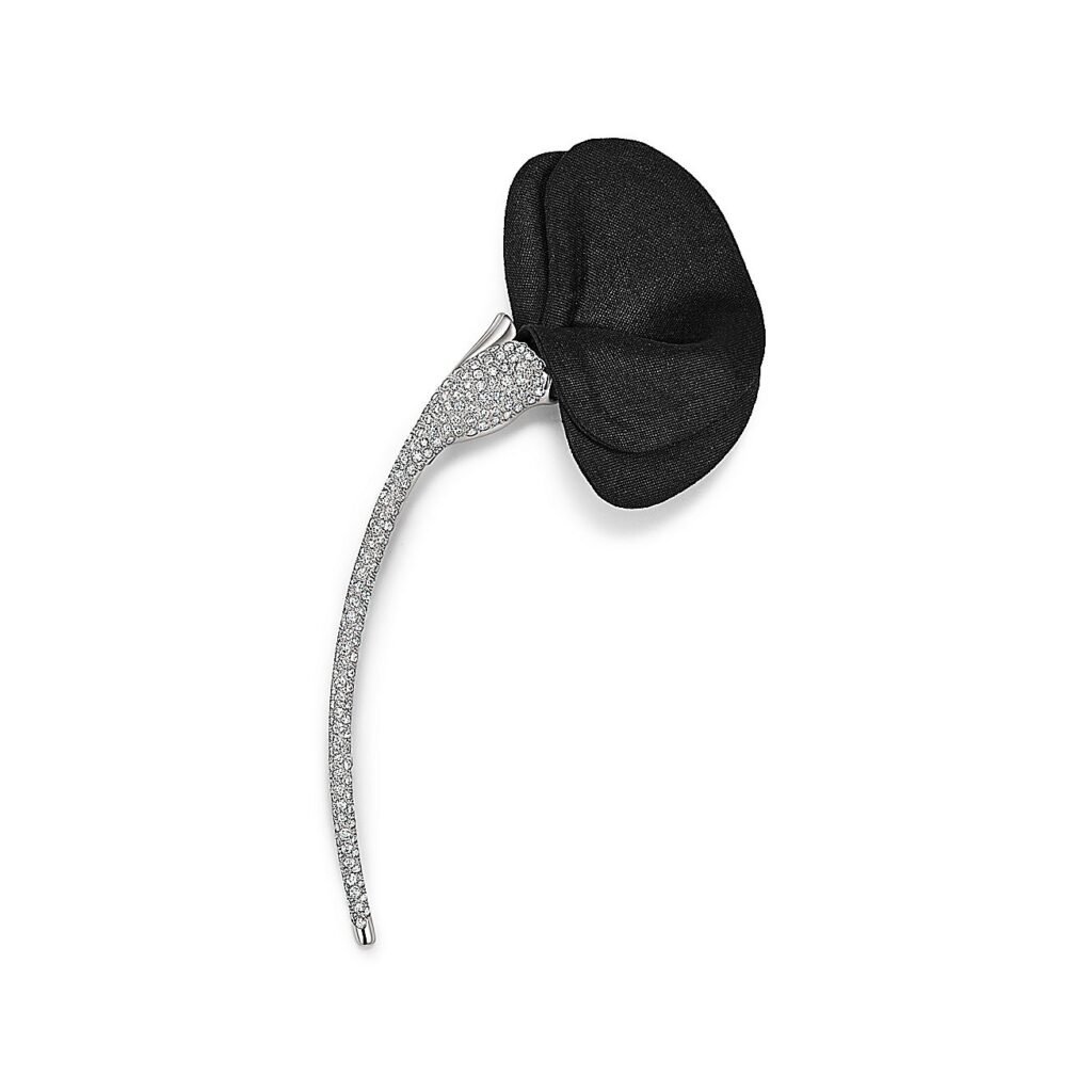O design Amapola de Elsa Peretti é a sua interpretação marcante da flor de Papoila. Criado em metal fino, diamantes e seda, o contraste cria uma bela tensão que capta a sublimidade da natureza. O broche é de Platina com pavé de diamantes e seda preta