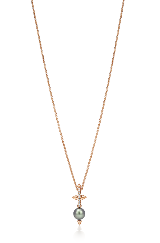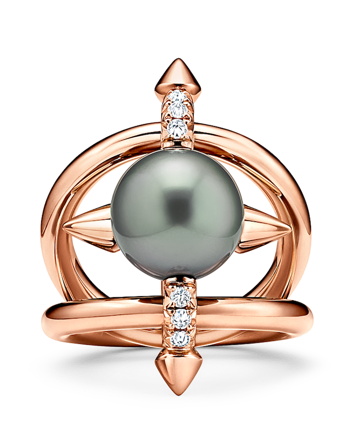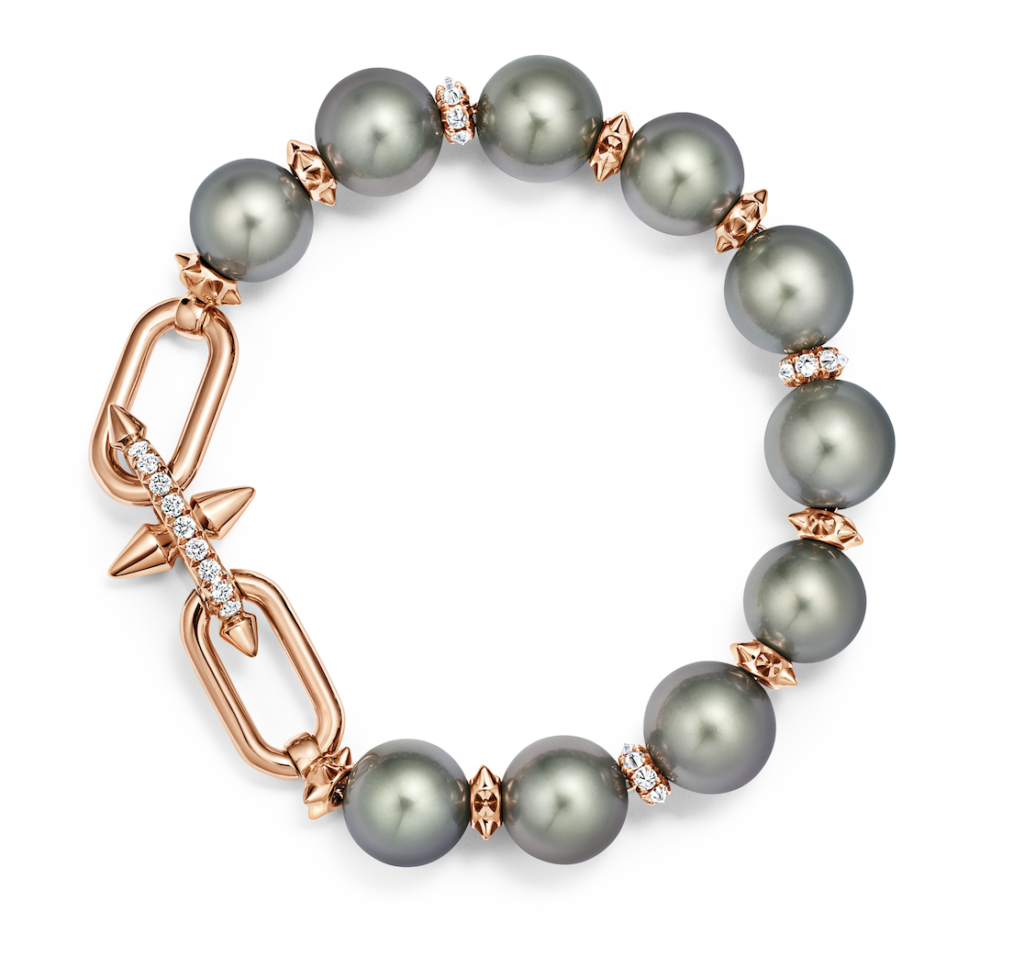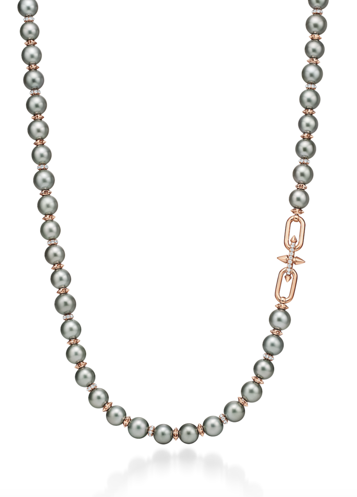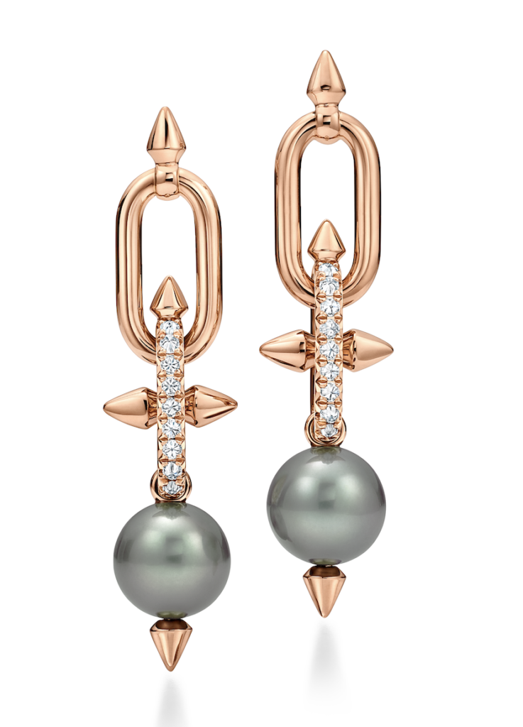 Os novos designs de pérolas taitianas da Tiffany Titan by Pharrell Williams são oferecidos em cinco estilos, incluindo pingente, brincos, colar, pulseira e anel, cada um deles feito em ouro rosa 18k com diamantes pavé. Na pulseira e no colar, elos de spikes confeccionados em ouro 18k alternam com as pérolas para uma estética marcante. Como líder em design inovador de jóias e artesanato especializado, a coleção Tiffany Titan by Pharrell Williams com pérolas do Taiti e diamantes demonstra o compromisso da Casa com a excelência criativa.